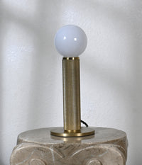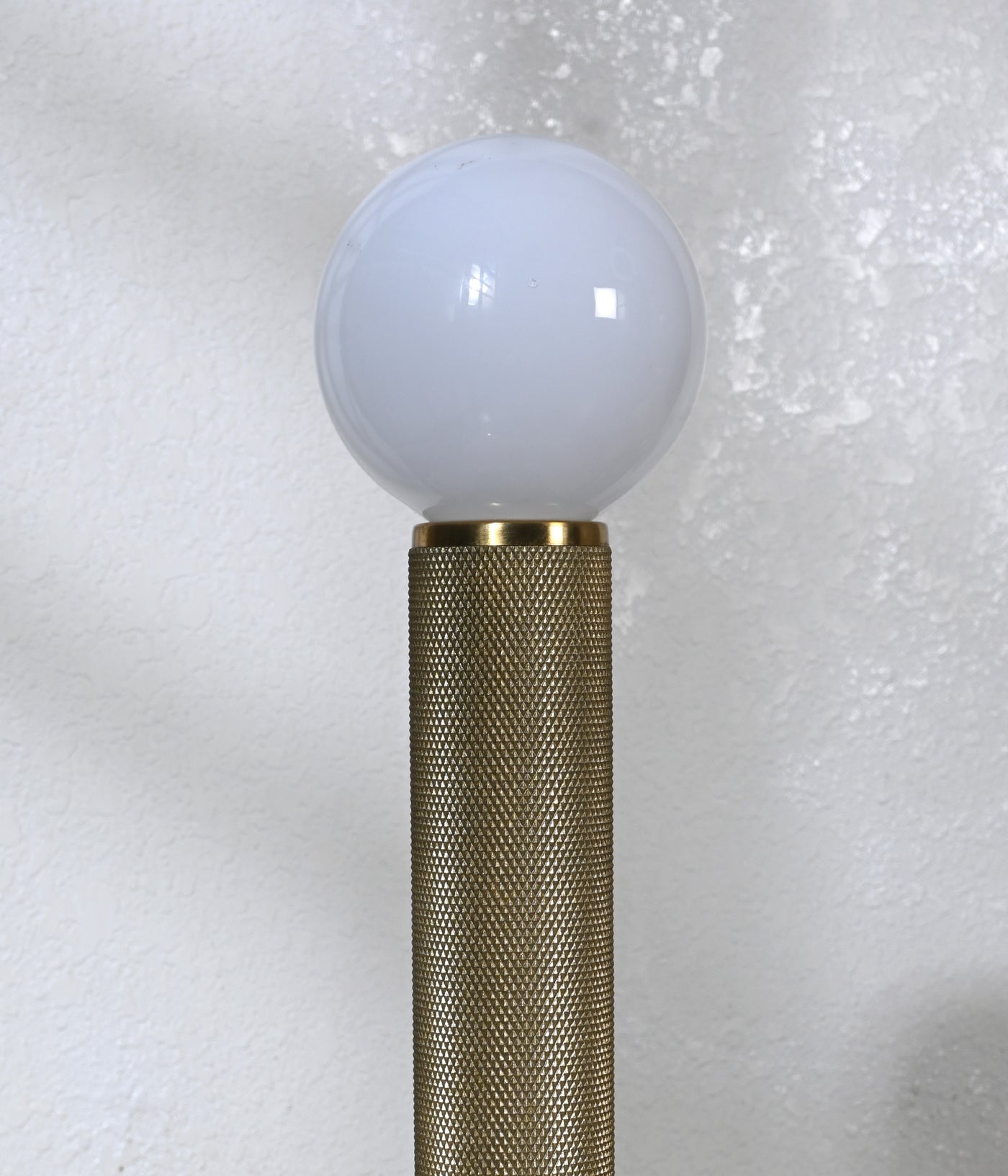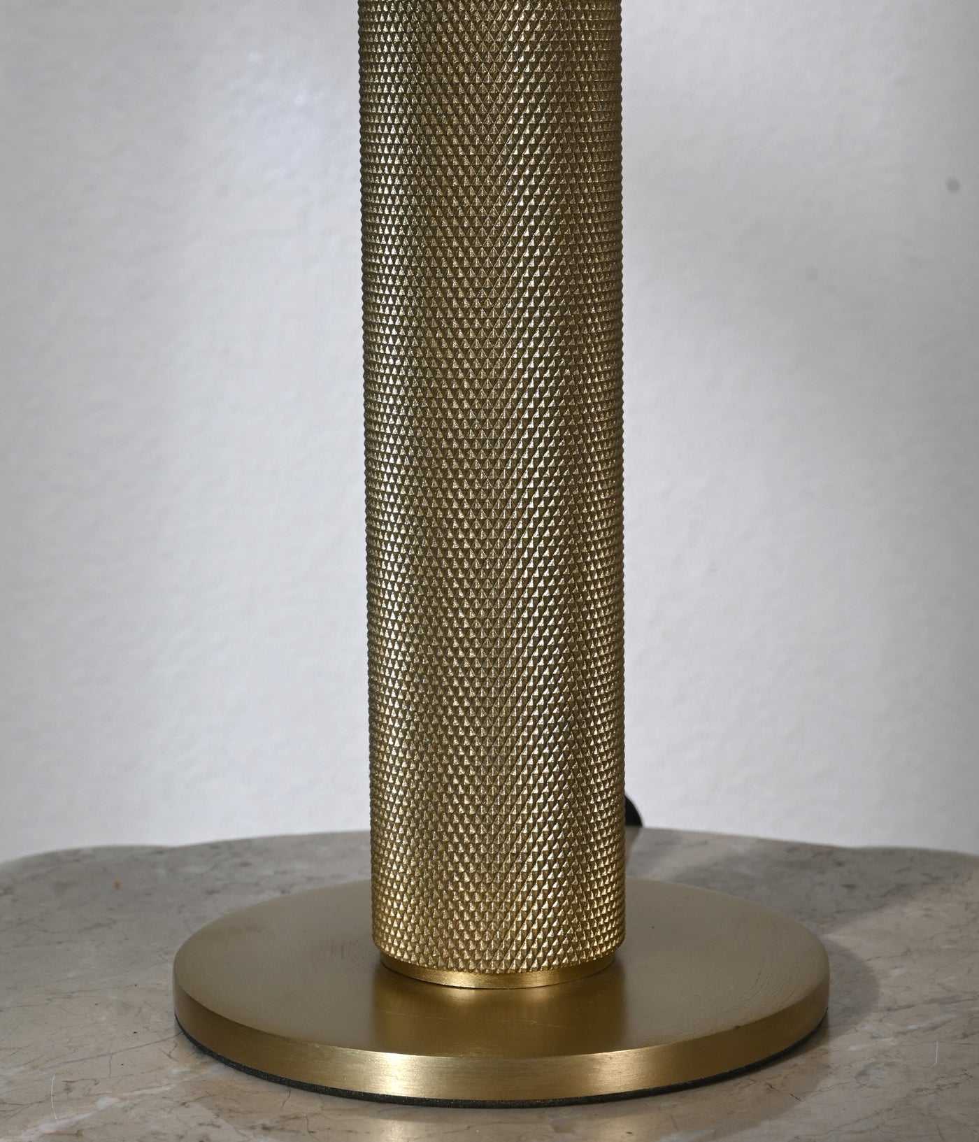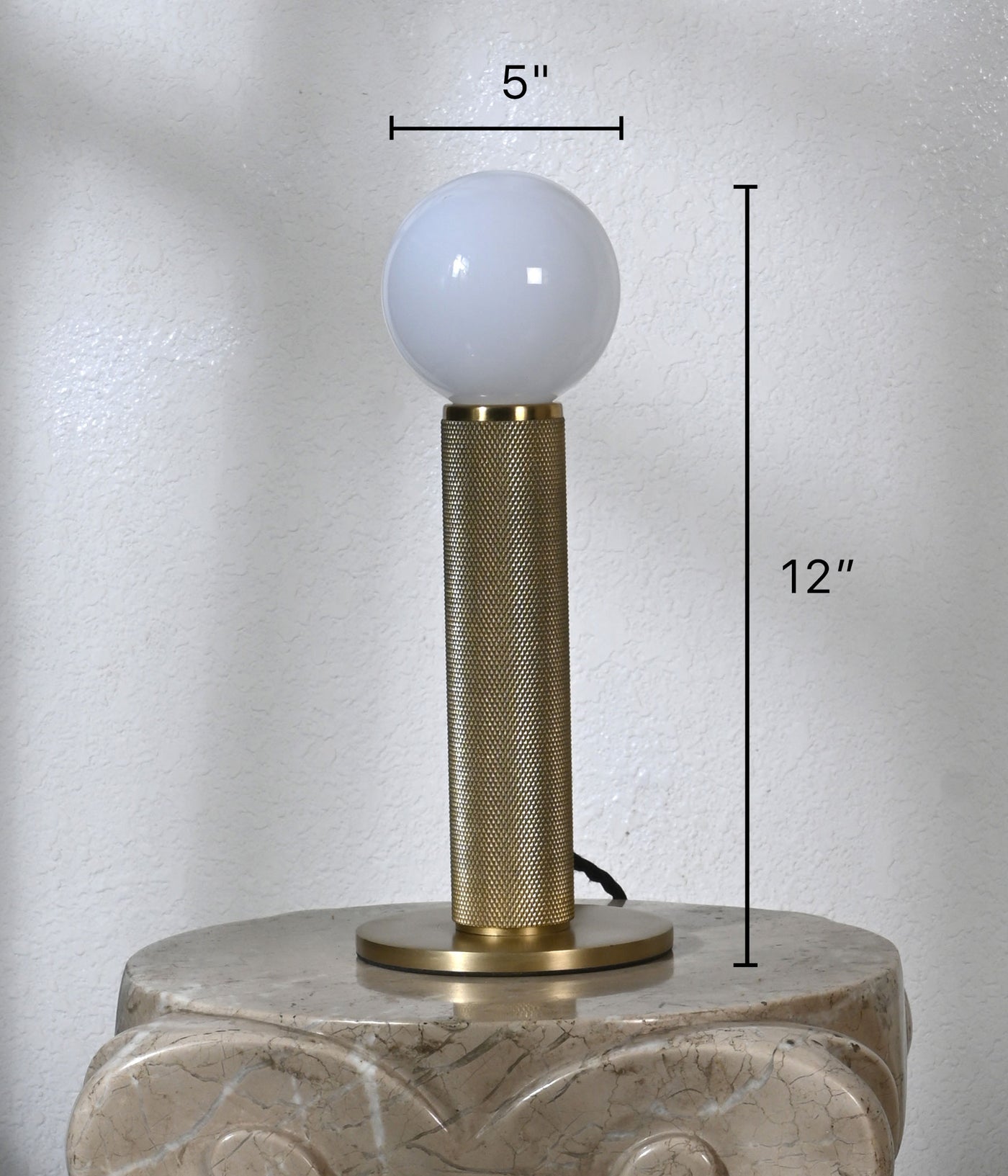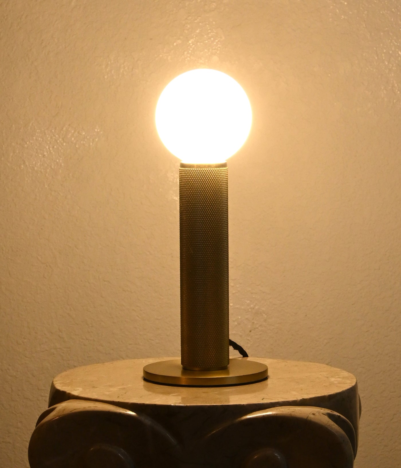 Industrial precision meets handcrafted beauty in this knurled metal lamp. Finished in matte brass, it holds a milky white bulb that casts a warm, diffused glow. The tactile grooves and metallic tones make it both modern and timeless, perfect for understated luxury settings.