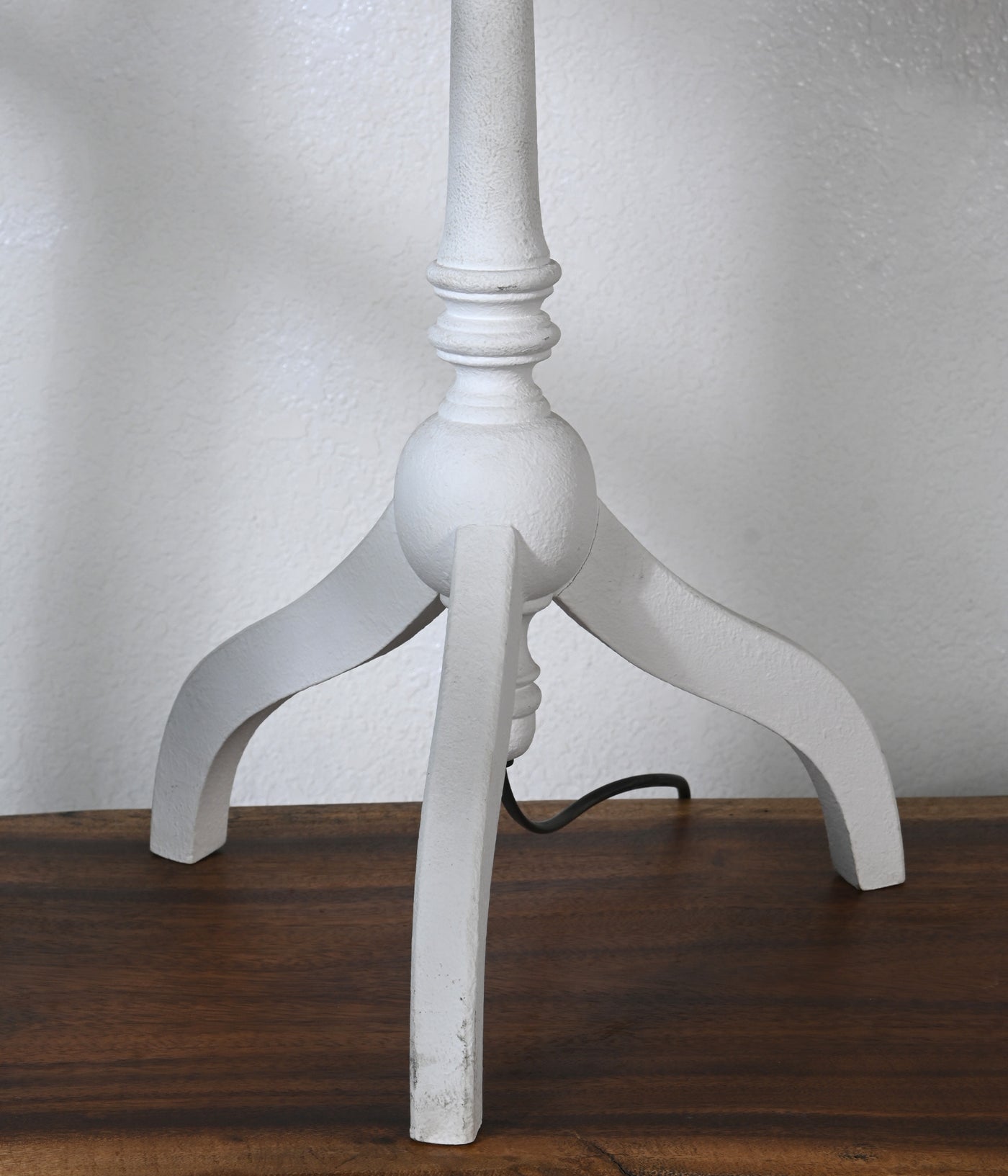Inspired by mid-century design, this tripod lamp is hand-shaped in mango wood and finished in an uneven matte white. Its black cotton shade lends modern structure and contrast. The result is sculptural, stable, and striking, a blend of artisan form and contemporary minimalism.