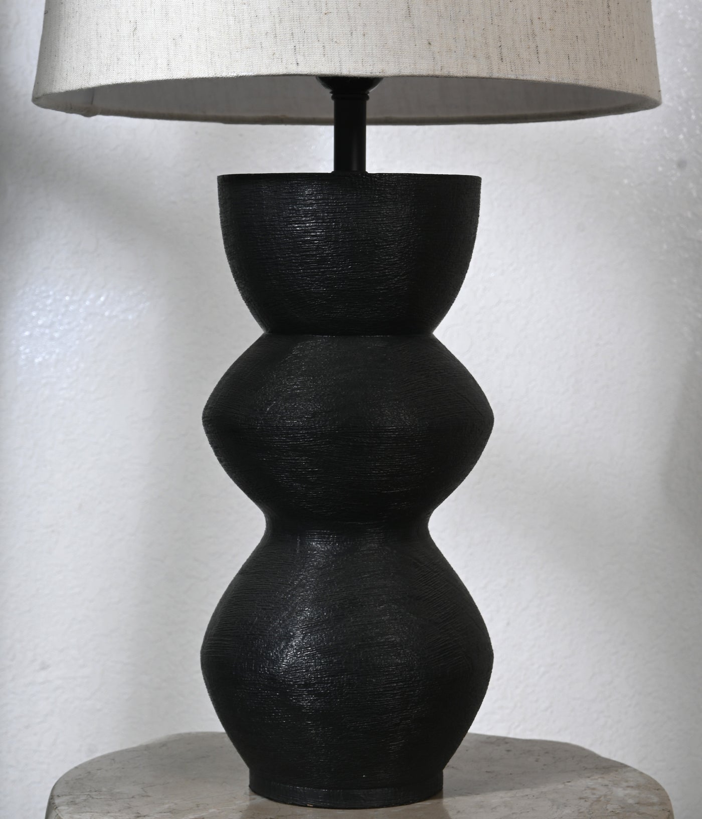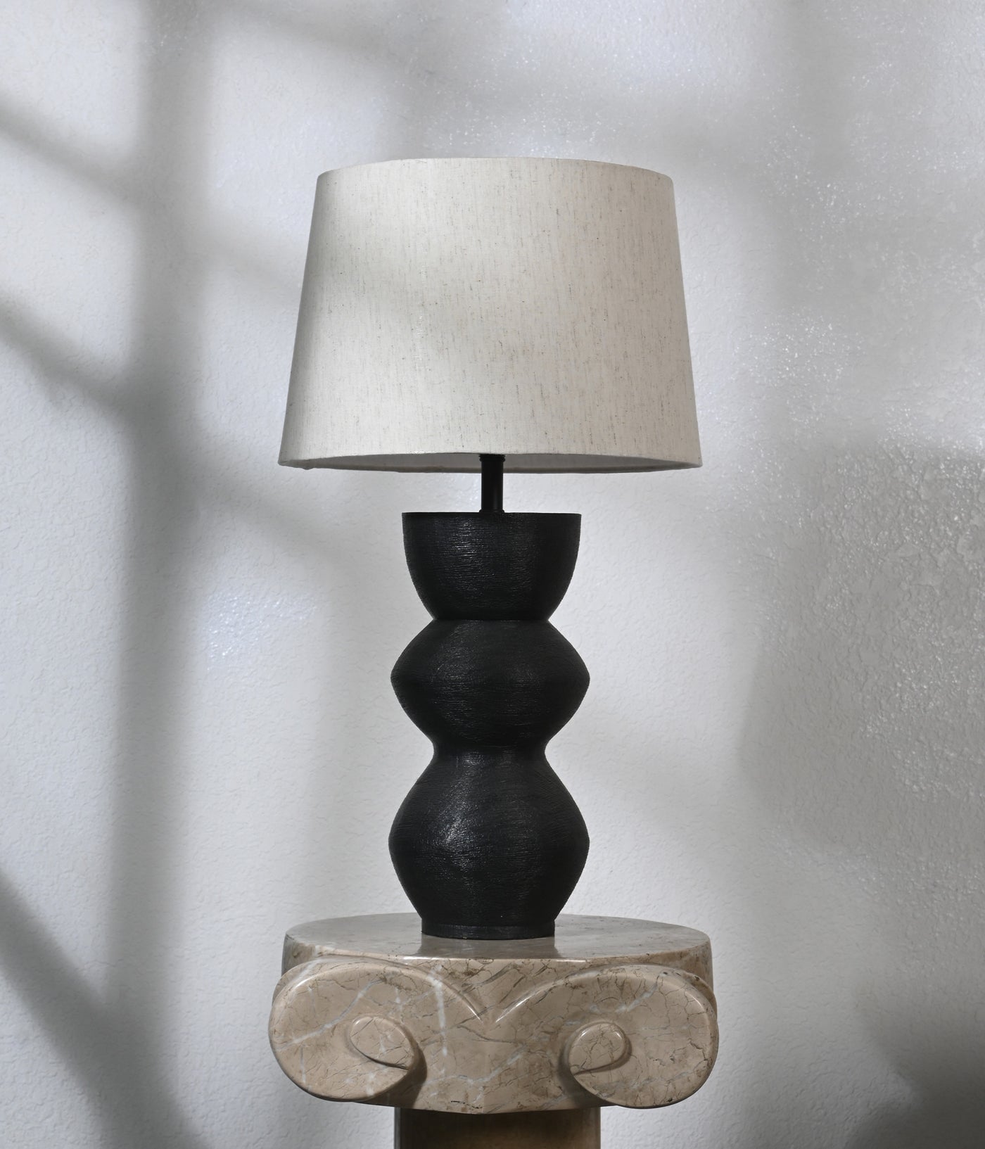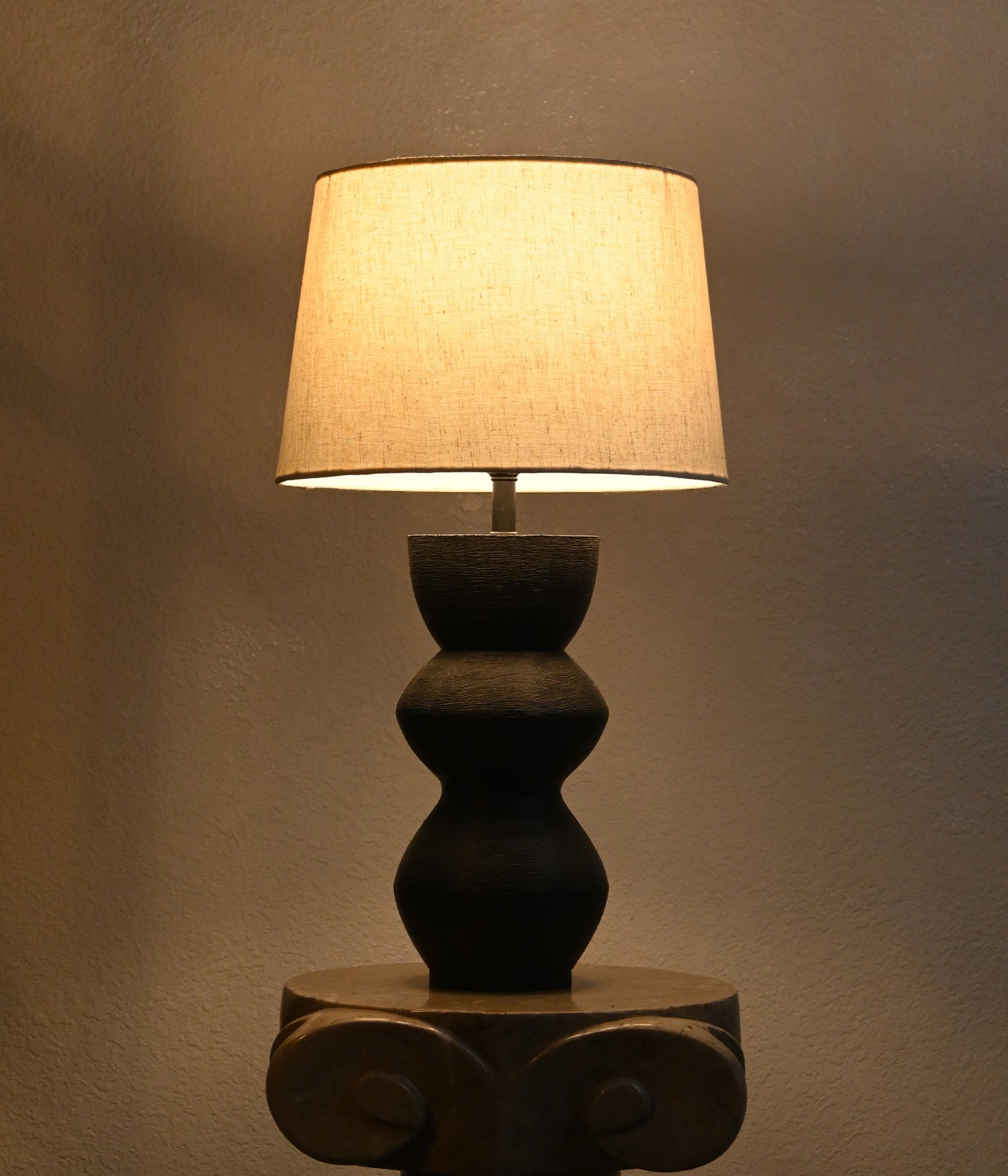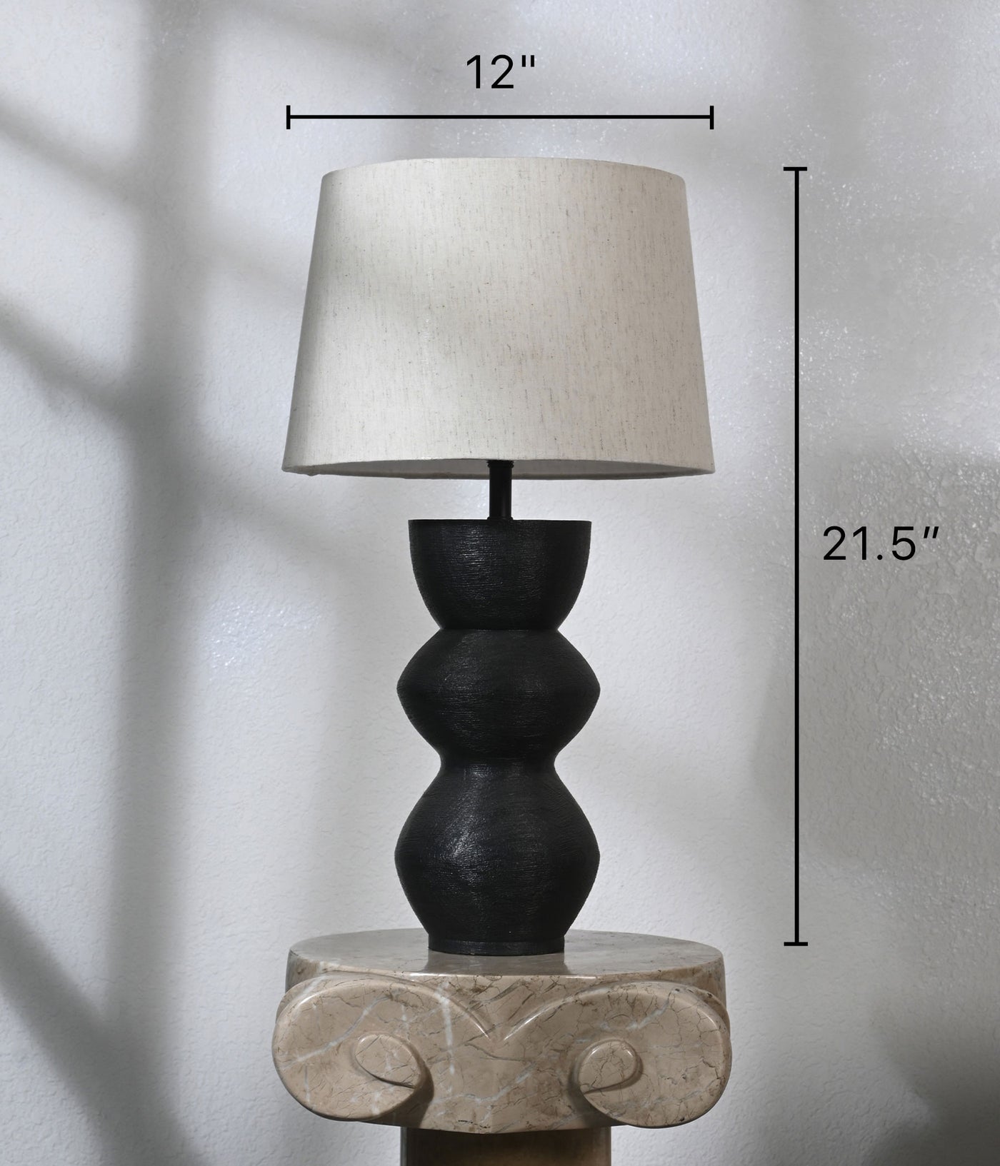 Crafted in matte black mango wood, this lamp is defined by simplicity and texture. The neutral beige shade diffuses light gently, creating an understated warmth perfect for contemporary, serene spaces.Dimensions- TOTAL HEIGHT-21.5" DIA-12"
