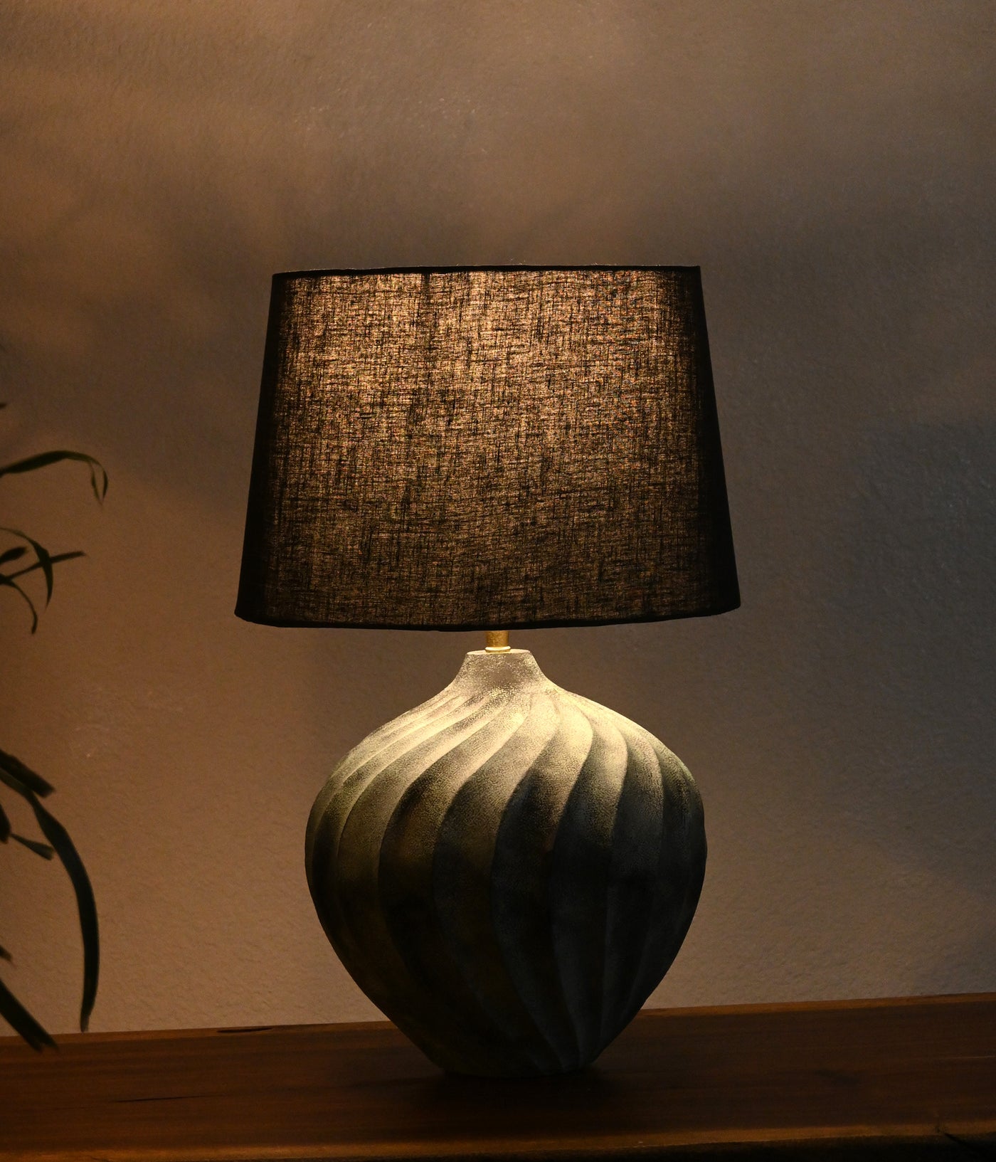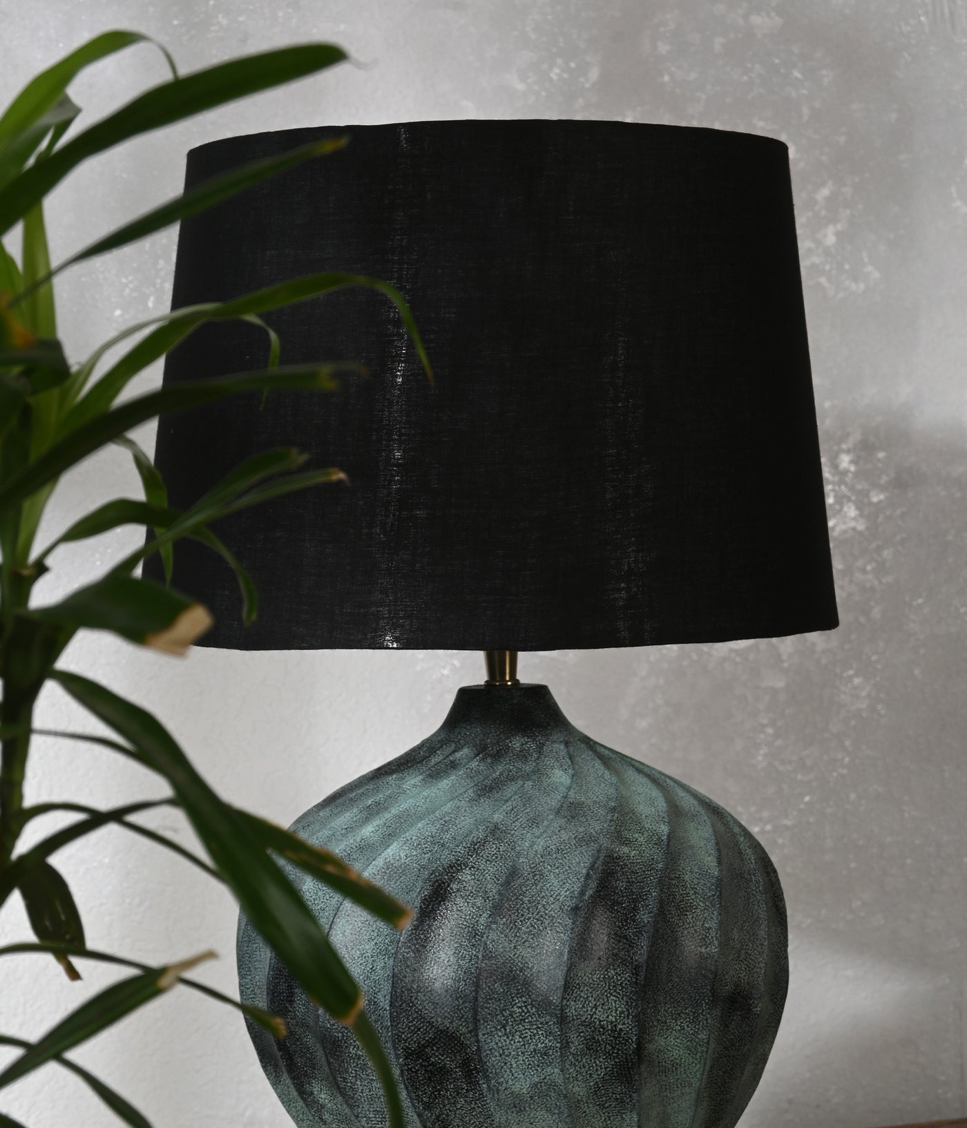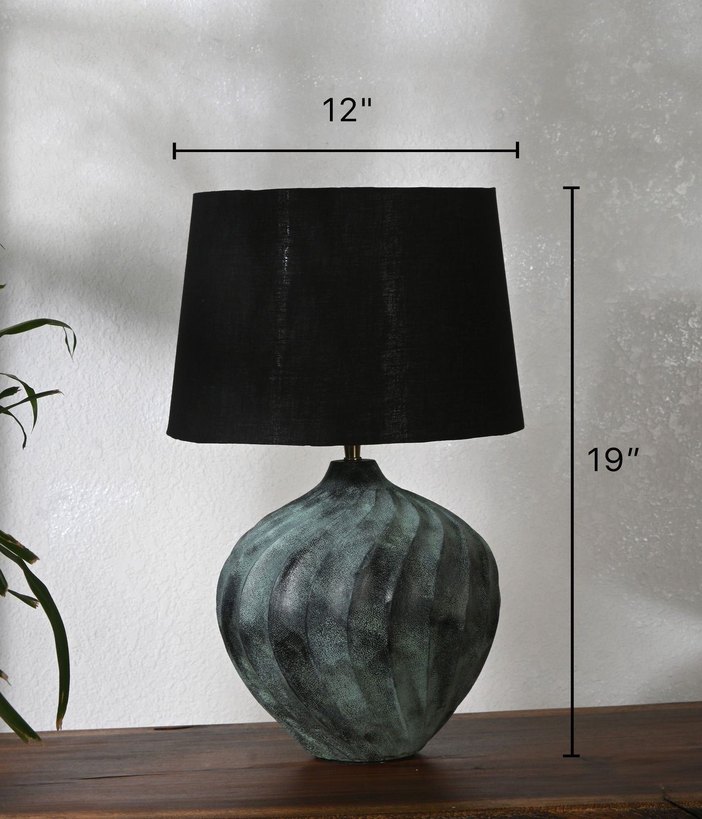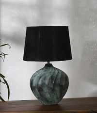 Textured and distinctive, this lamp features a special green patina finish that feels organic yet sophisticated. Paired with a complementing lampshade, it radiates a soft, diffused glow that enhances its sculptural metal base. Elegant and versatile, it lends personality to spaces with understated artistry.